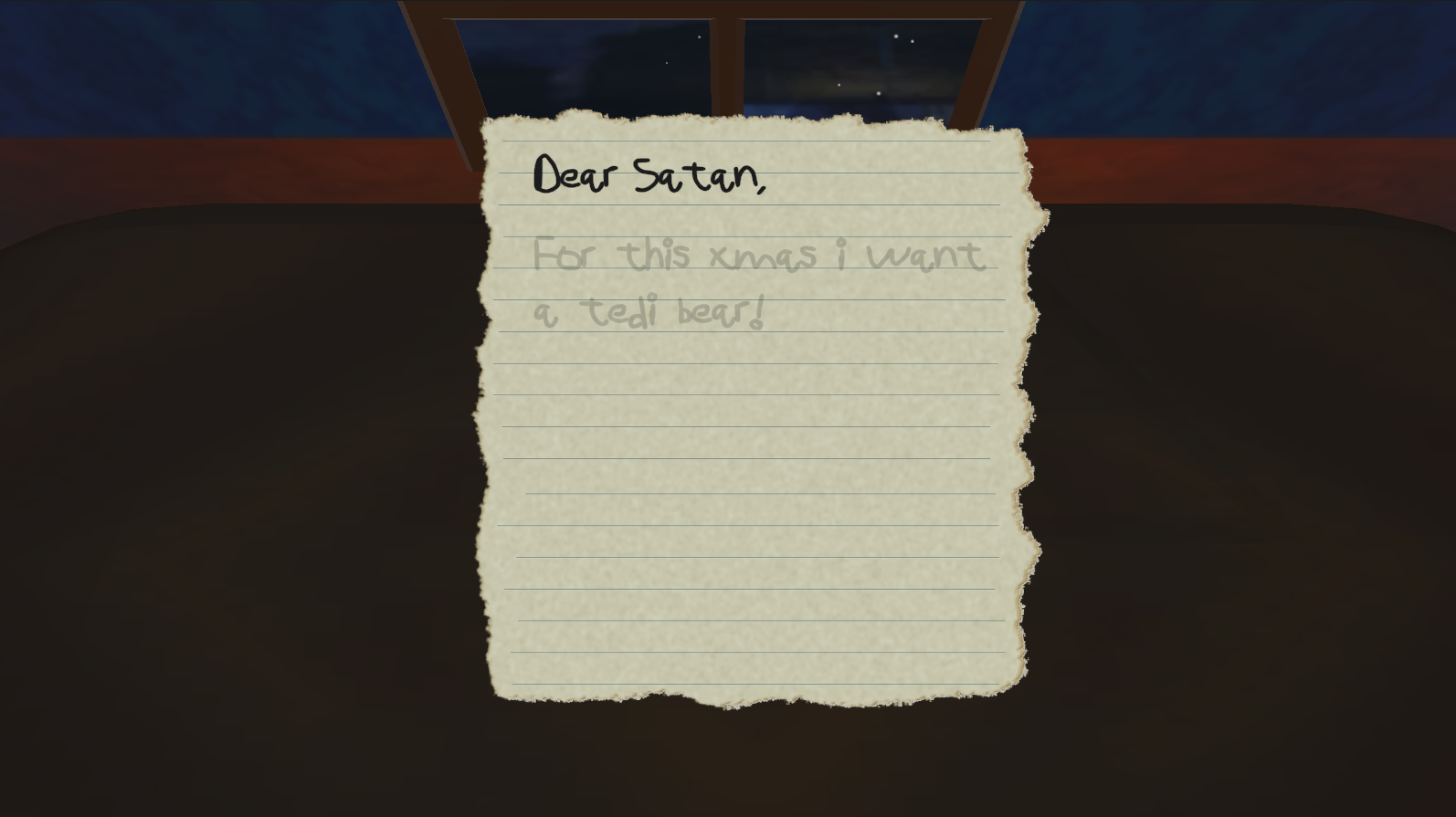 Trapped during a night that was supposed to be magical, the player must survive until morning while being hunted by corrupted holiday creatures: Satan, a reindeer, imps, a snowman, and a cursed teddy bear.